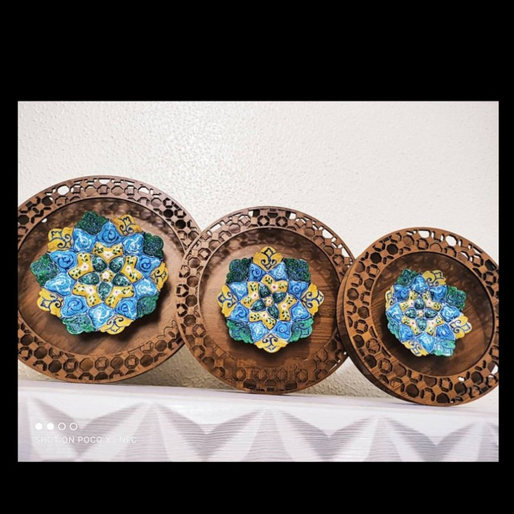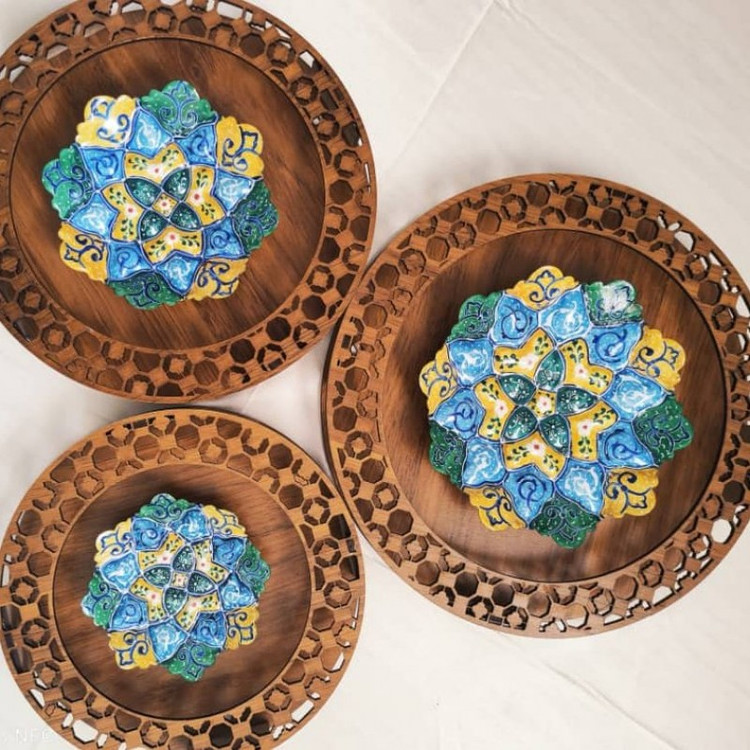 اندازه: سری سه تیکه ی میناکاری شده ،اندازه ی بشقاب هابه ترتیب۸،۱۰،۱۲سانت می باشد.اندازهی قاب هابه ترتیب۱۴،۱۶،۱۹سانت می باشد.